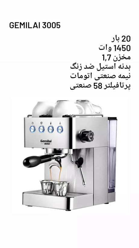 اسپرسوساز نیمه صنعتی جیمیلای Gemilai طراحی عالی یک دستگاه پر قدرت و کاملاً کاربردی برای مصارف خانگی و یا کافه ها است اسپرسوساز نیمه صنعتی جیمیلای Gemilai دارای پمپ فشار 15 بار و اجزا داخلی و لوله های بخار از فولاد ضد زنگ و قدرت 1450 وات می باشد .